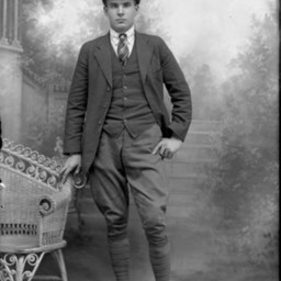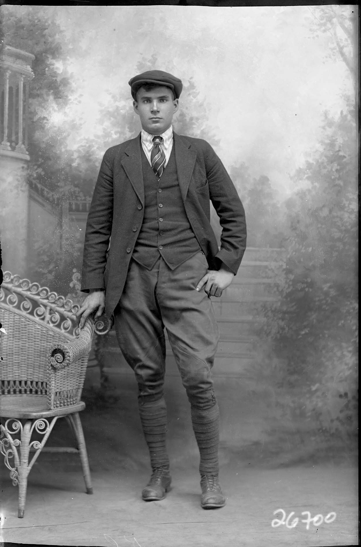 Unidentified man in a tie and cap is standing by a wicker chair and wearing riding pants with puttees.