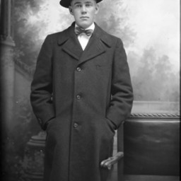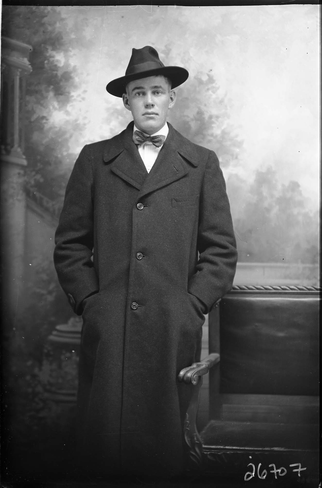 Unidentified man in a hat and bow tie is standing by a bench with his hands in the pockets of his overcoat.