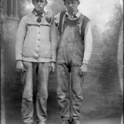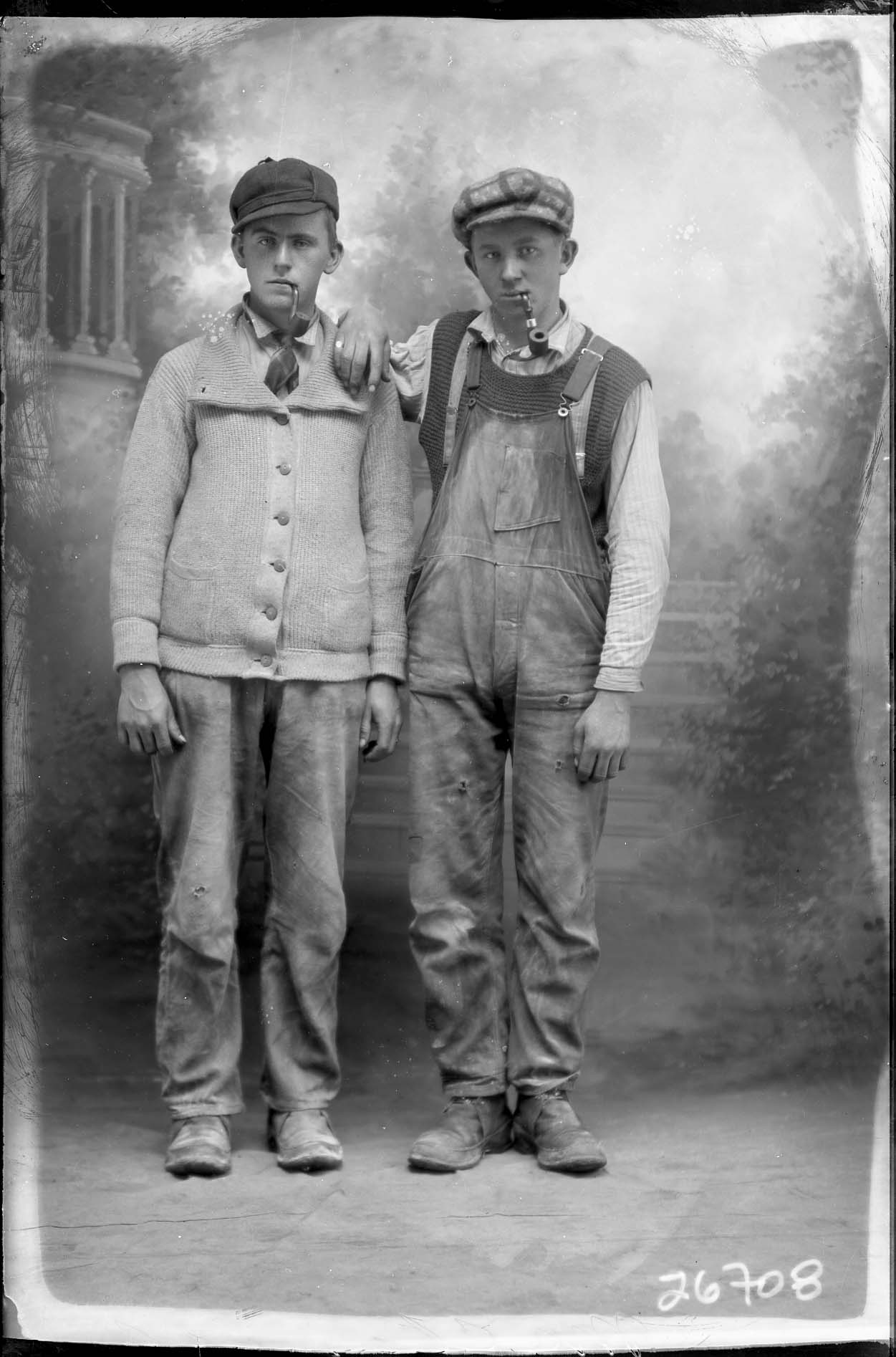 Two unidentified young men are standing together in working clothes.