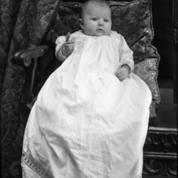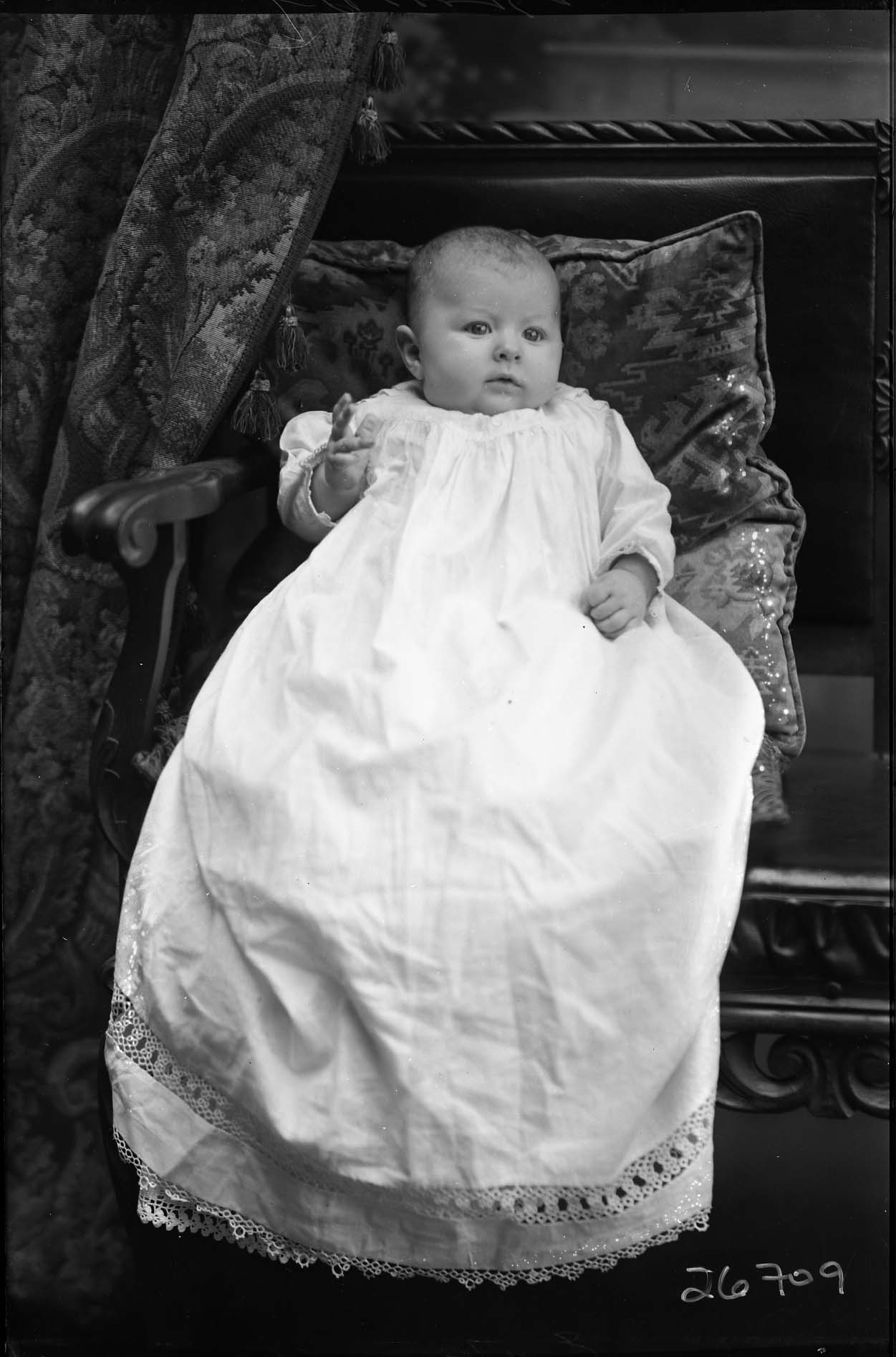 Unidentified baby in a long white gown is propped against pillows on a bench.