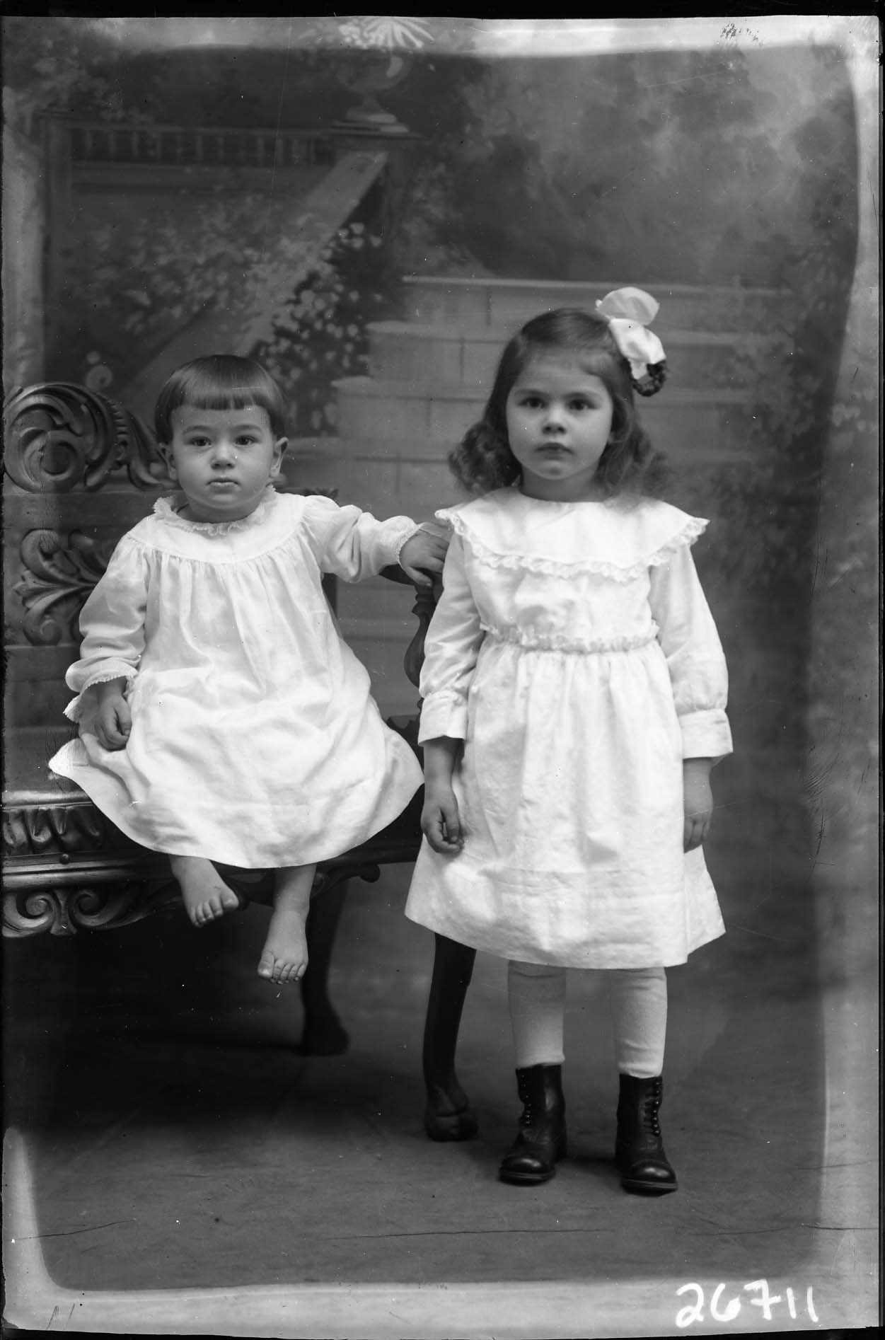 Two Young unidentified children, a barefoot toddler with bangs and an older girl with a bow in her hair, are posed together with a bench.