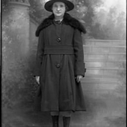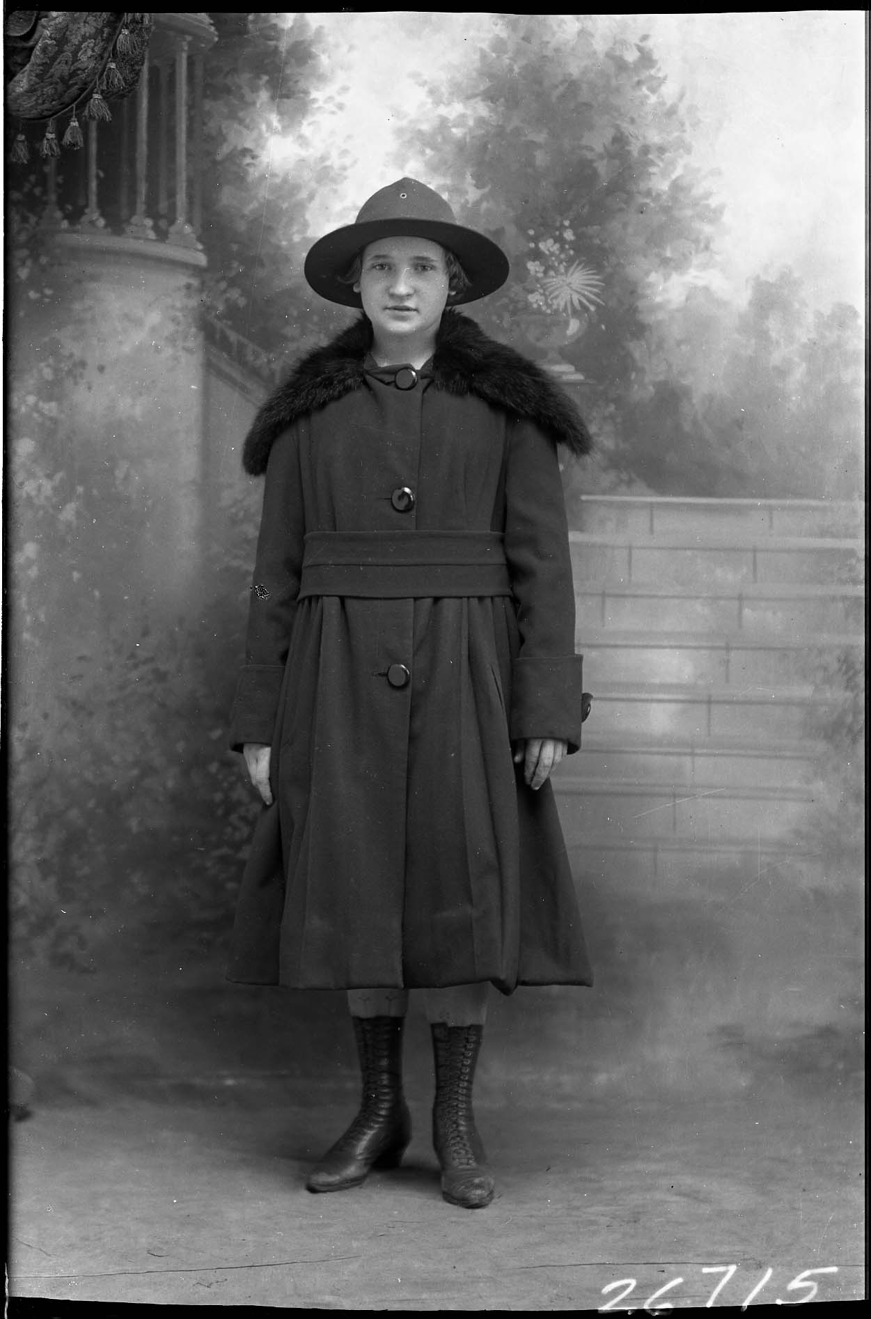 Unidentified young woman is wearing a hat, fur collar, and overcoat with three large buttons down the front.