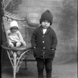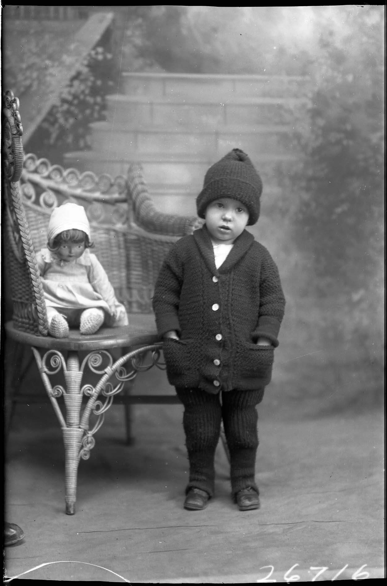 Unidentified young child in a wintry hat, sweater, and pants is posed beside a wicker chair and a doll.
