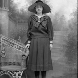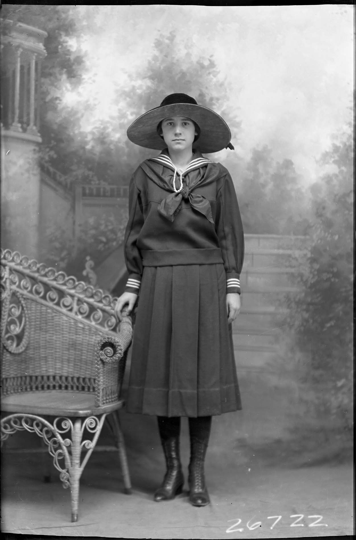 Unidentified young woman in a wide-brimmed hat and sailor-themed outfit, is standing by a wicker chair.