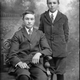 Two unidentified boys in similar suits and ties with short pants, are posed together, one seated and the other standing.