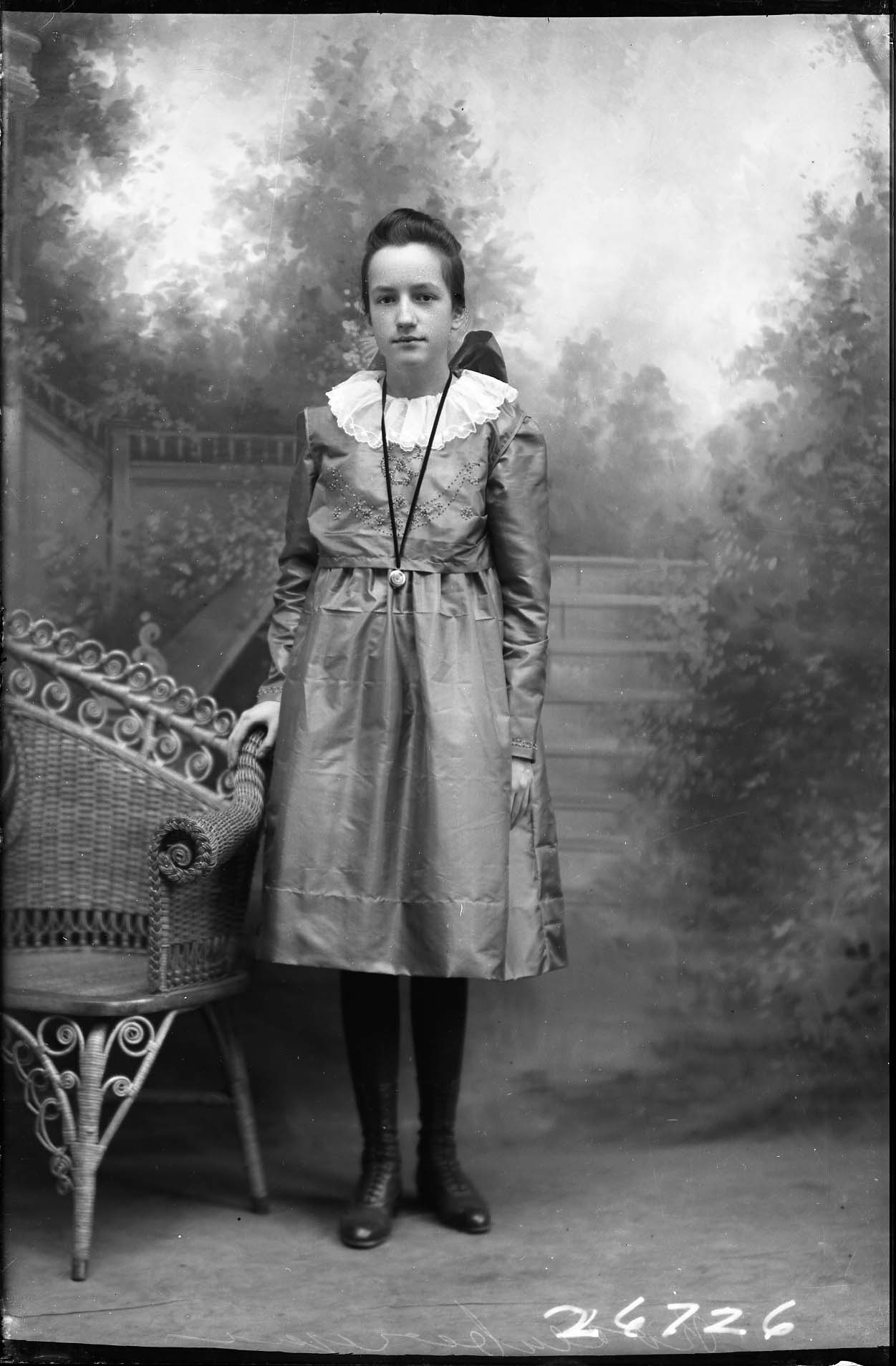 Photograph of Virginia (Rosenberger) Dellinger standing by a wicker chair as a teen-aged girl.