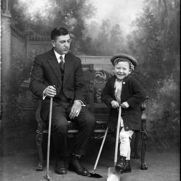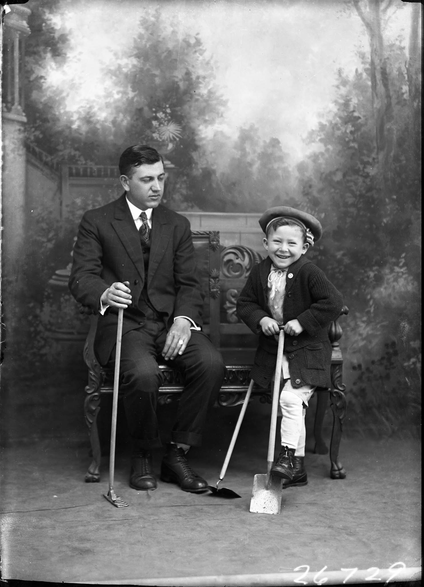 Unidentified man in a suit is seated and looking down at an unidentified boy, smiling, who is wearing a hat and posed with child-sized garden tools.