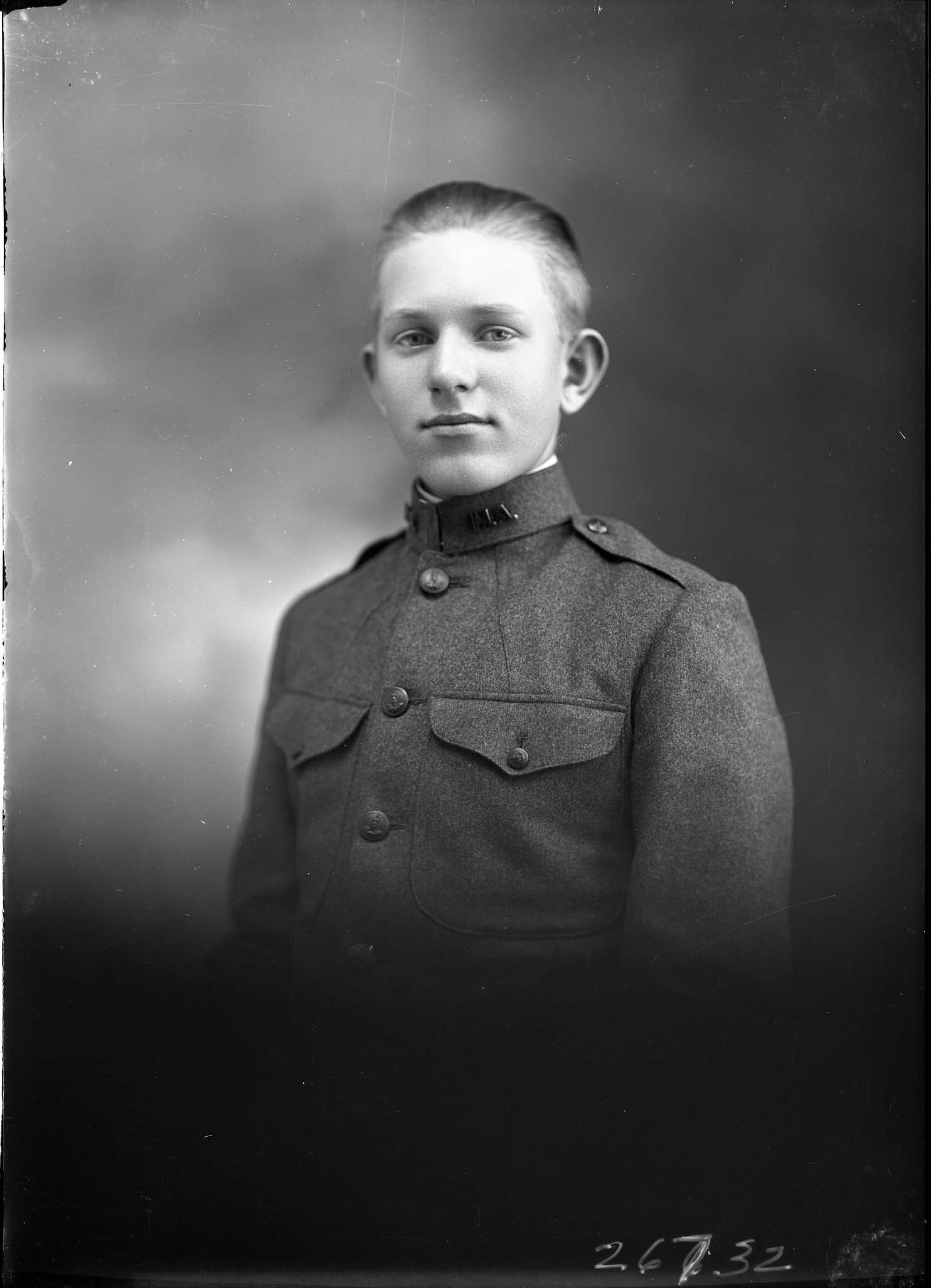 Portrait photograph of an unidentified cadet from Massanutten Military Academy (MMA) wearing his school's uniform.