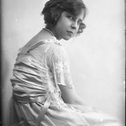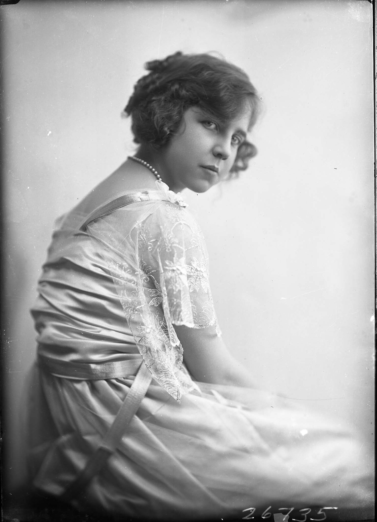 Unidentified young woman with short hair and wearing a faux pearl necklace is seated and facing away from the camera with her face turned back and looking over her shoulder.
