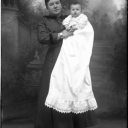 Unidentified woman is standing and holding an unidentified baby in a long white gown in her arms.