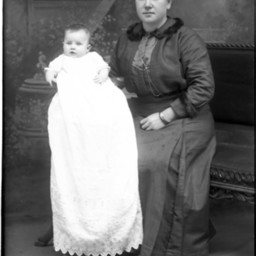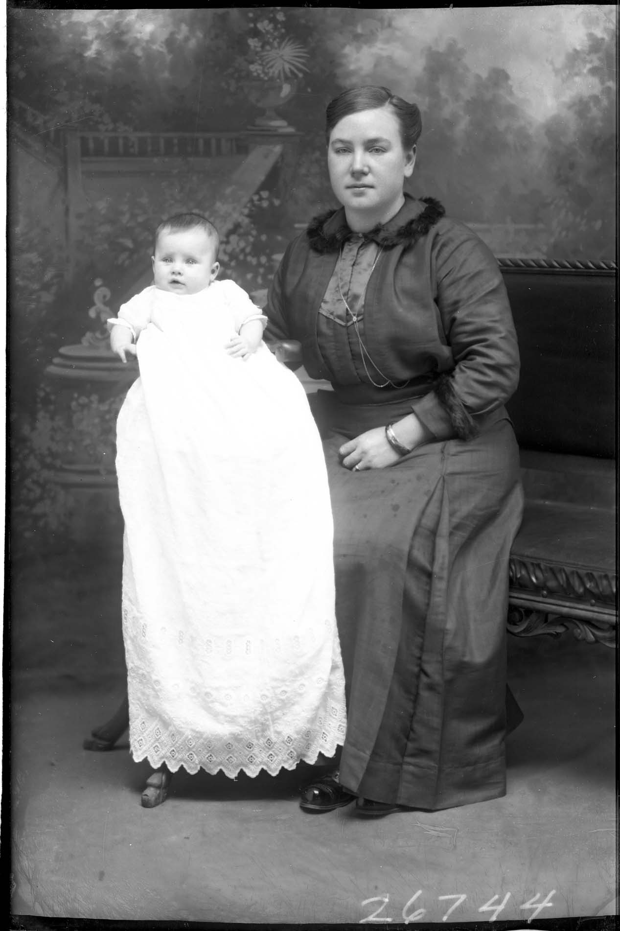 Unidentified woman, seated, with an unidentified baby in a long white gown posed with her.