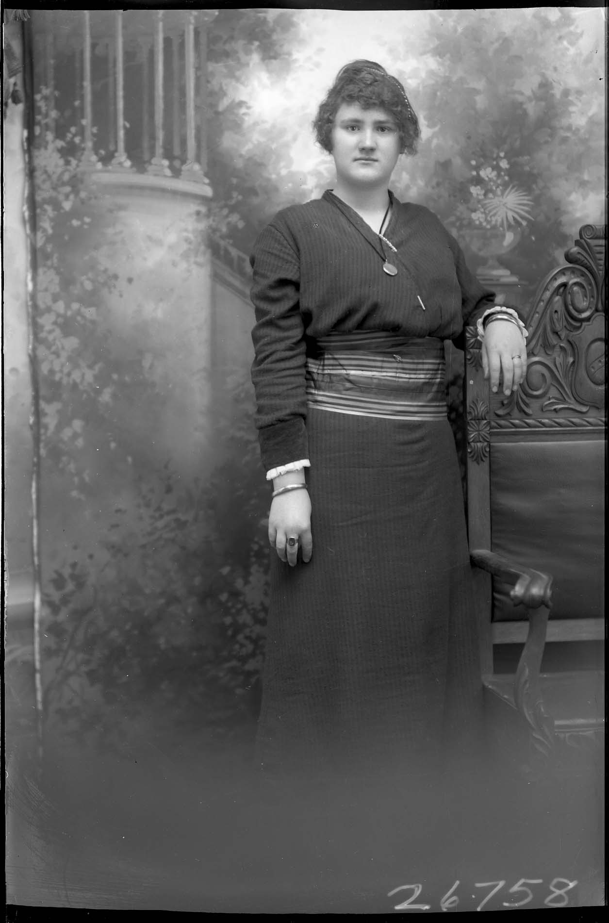 Unidentified young woman wearing a locket and a dress with a horizontally striped sash around the waist, is standing by a bench.