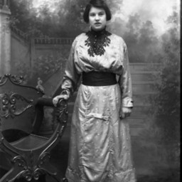 Unidentified woman with short dark hair is standing by a chair and wearing a long dress with a cummerbund-styled waist.
