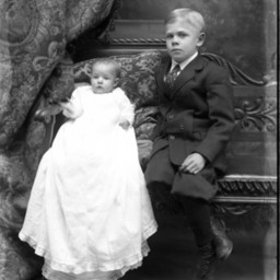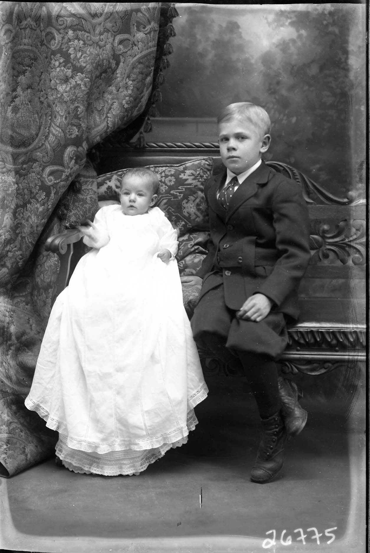 Two unidentified children, a baby in a long white gown and an older blond boy in a suit with short pants, are posed together.