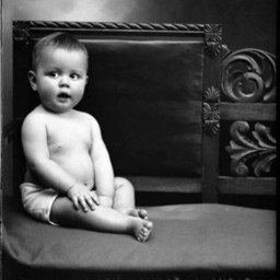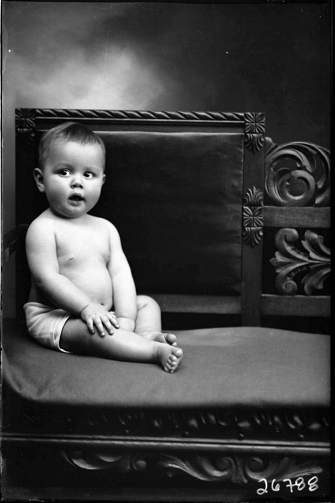 Unidentified barefoot young child wearing only a diaper, is seated on a bench.
