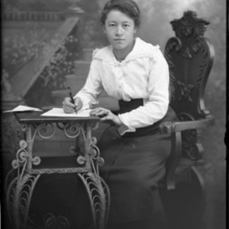 Unidentified woman is seated at a small table and posed holding a pen to paper as though she was about to write something.