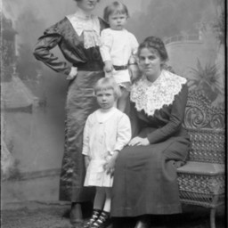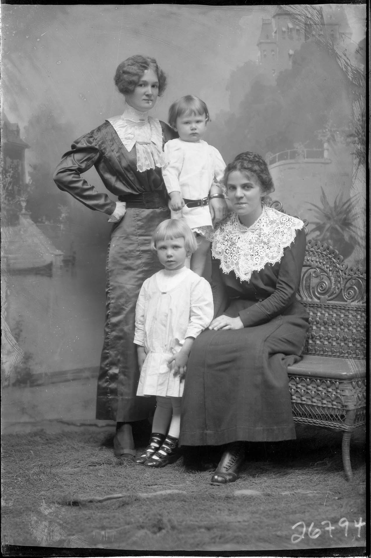 Two unidentified adult women, one standing and one seated, are posed with two unidentified young children between them.