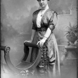 Unidentified young woman with her hair pulled back and parted in the middle, is standing by a chair and wearing a locket with her long dress.