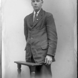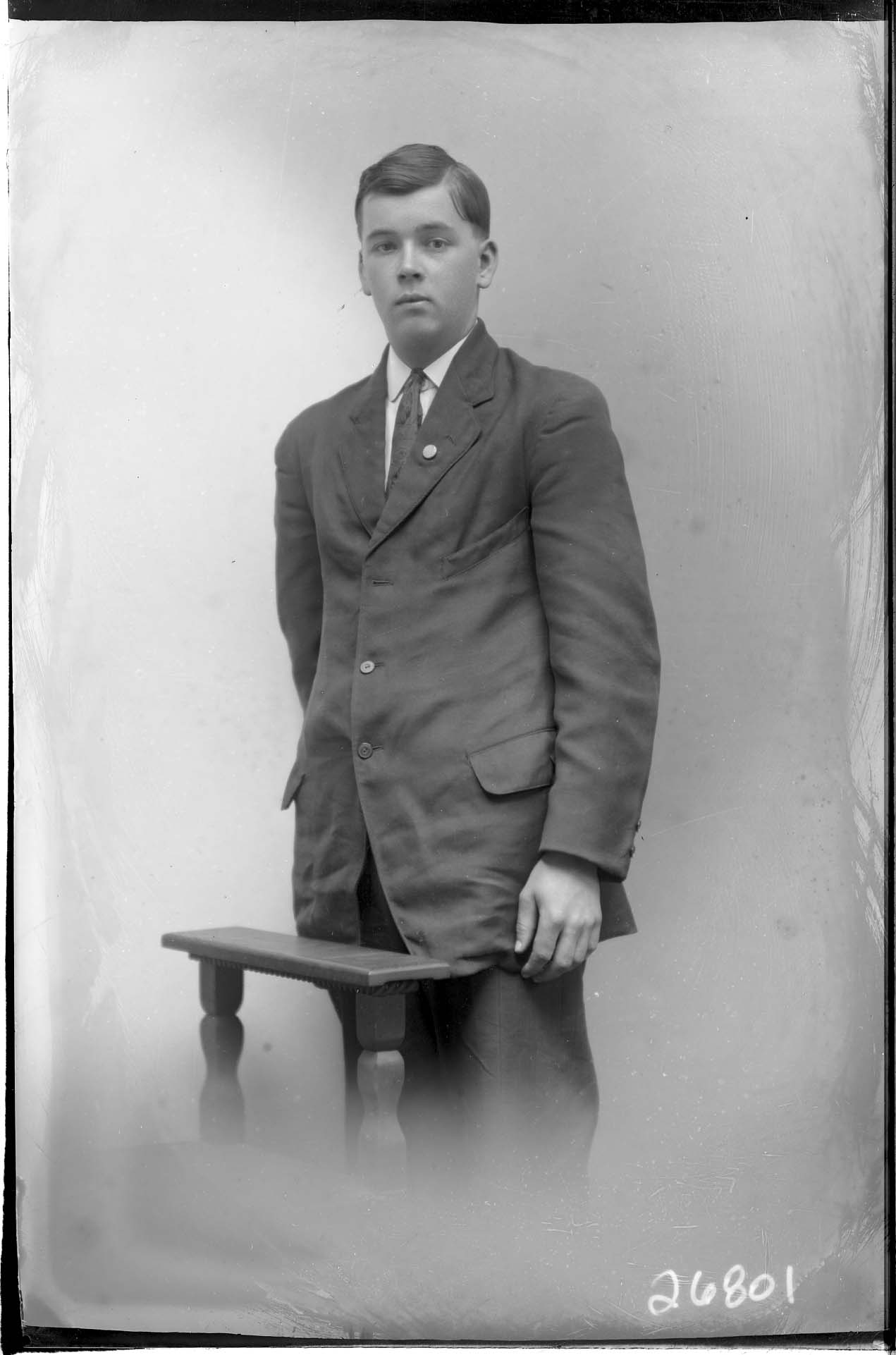 Unidentified young man wearing a suit and tie with a pin on his lapel, is standing by a chair.