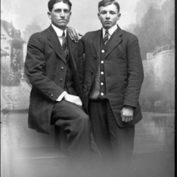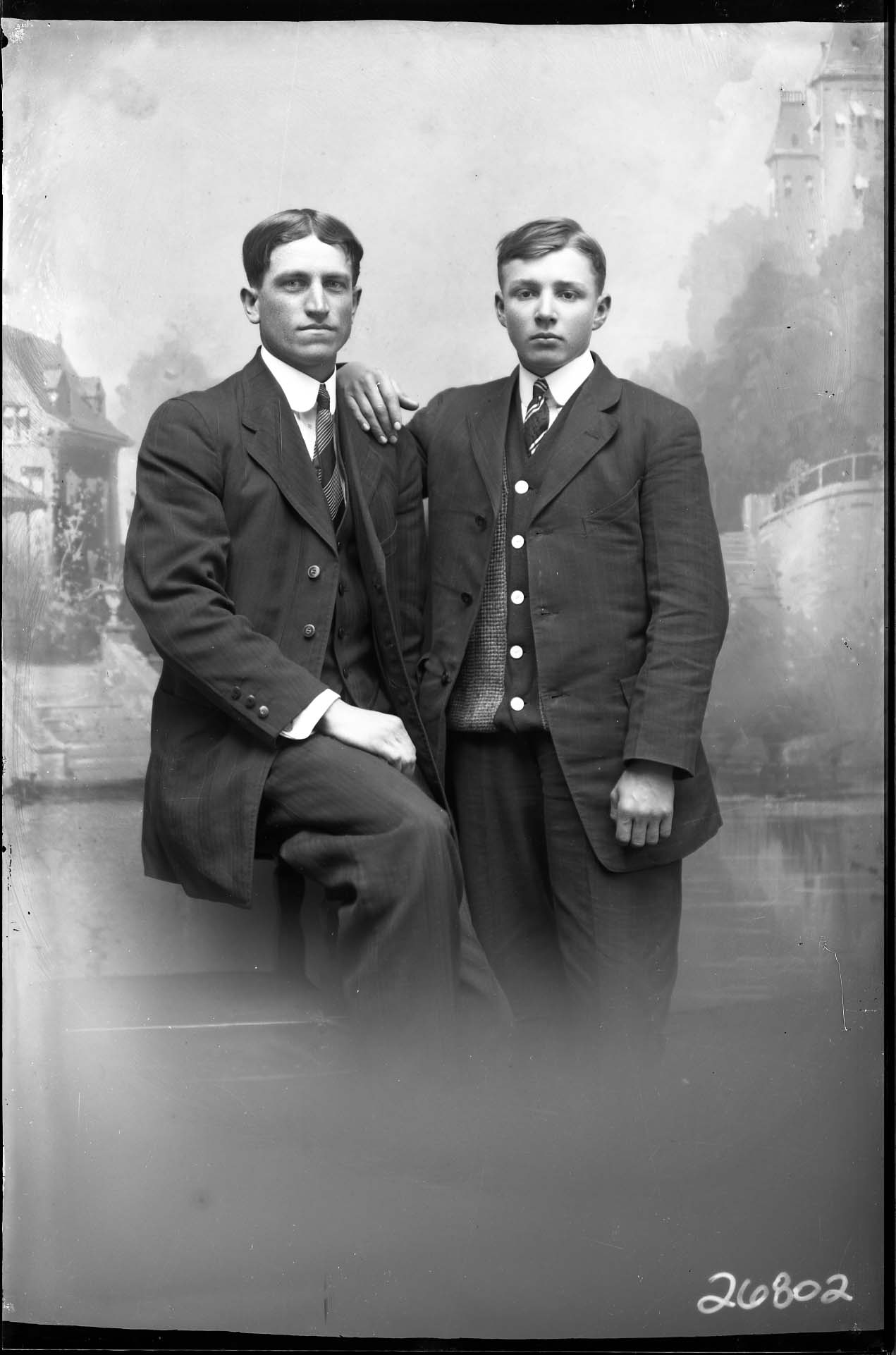 Two unidentified young men, one older than the other, are posed together wearing suits and striped ties.
