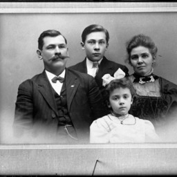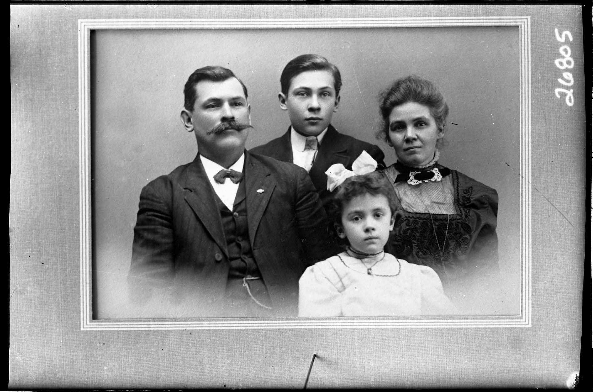 Photo of a framed portrait photograph of an unidentified man with a mustache and bow tie posed beside an unidentified woman. Two unidentified children, an older boy and a younger girl with a bow in her hair, are between them.