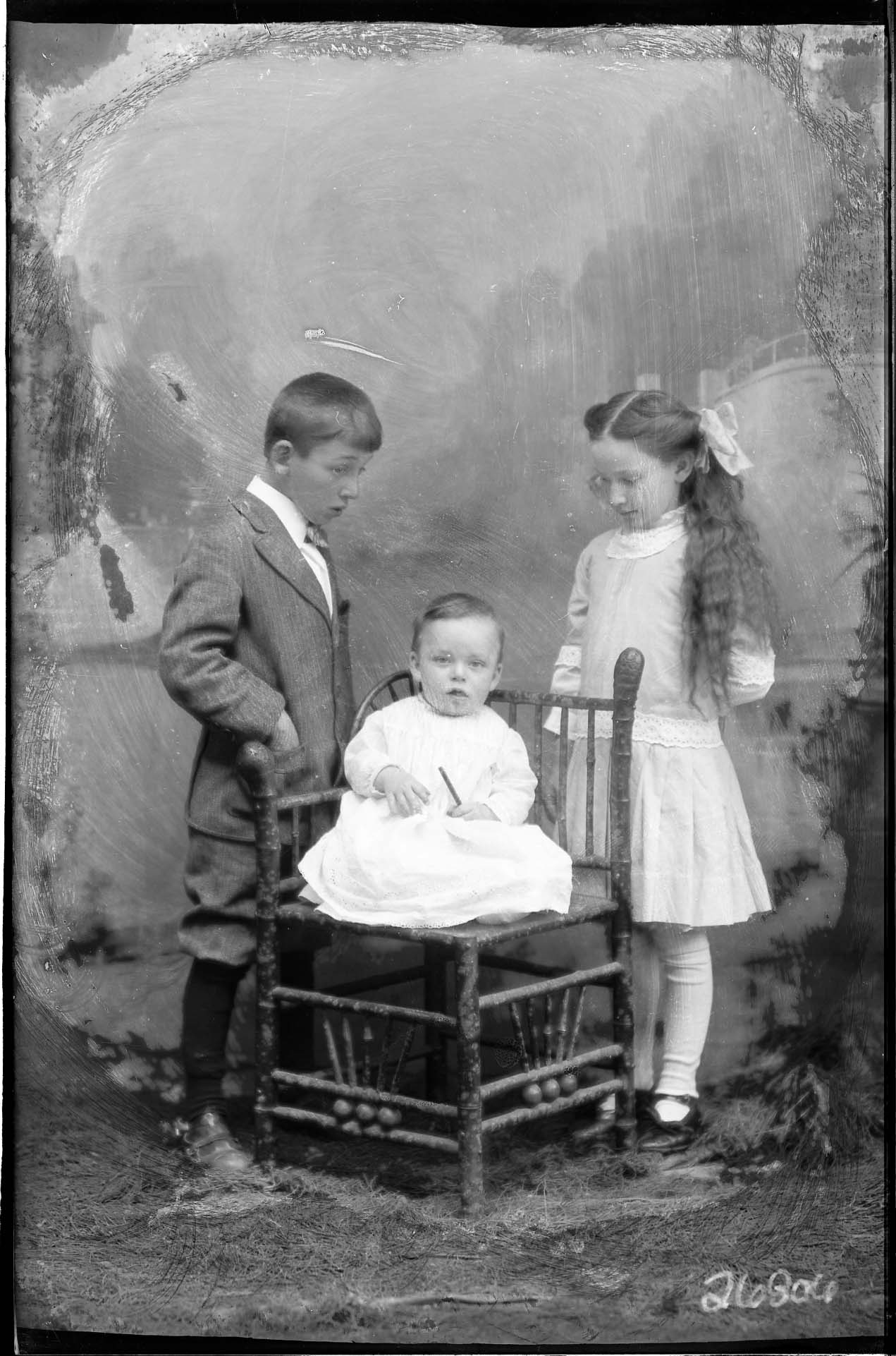 A boy with his hands in his pockets and a girl with bows in her long hair are both looking down at the unidentified young child seated on a chair between them.