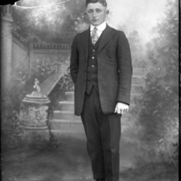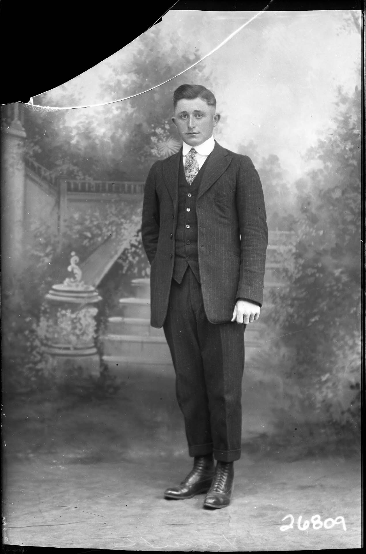 Unidentified young man is wearing a suit and tie and standing with one hand behind his back.