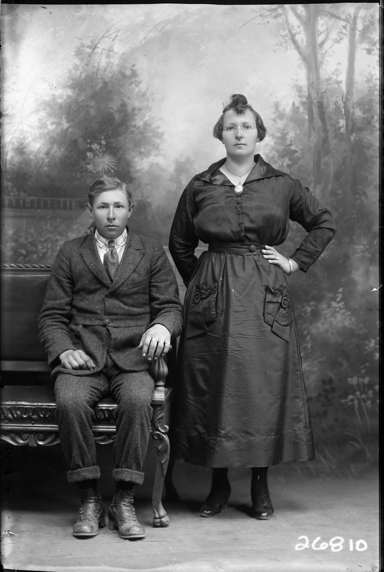 Photograph of Robert William Hansberger, seated, and his older sister, Ada V. (Hansberger) Barb standing beside him.
