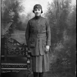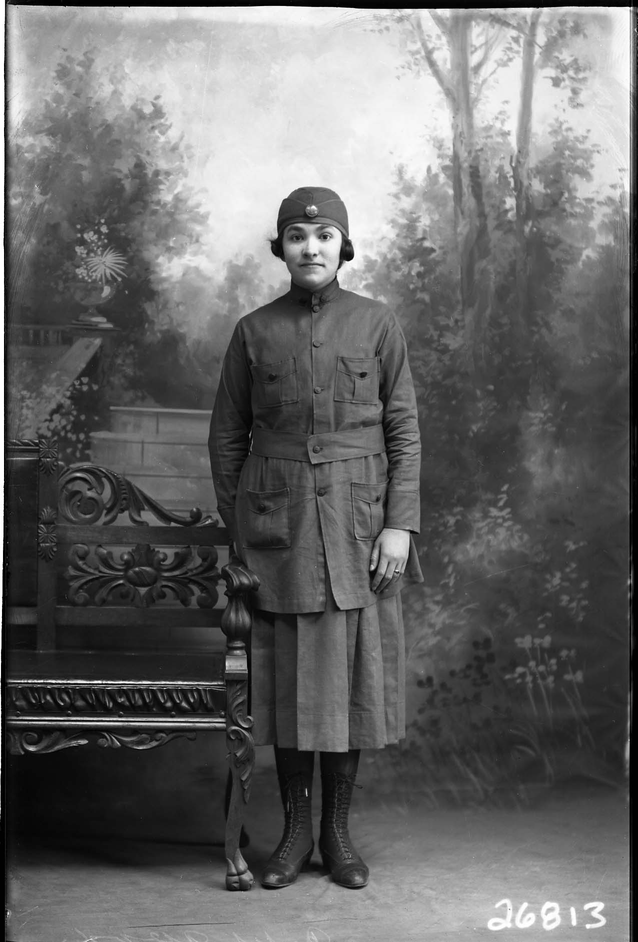Unidentified young woman standing by a bench and wearing a hat and buttoned jacket.