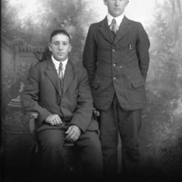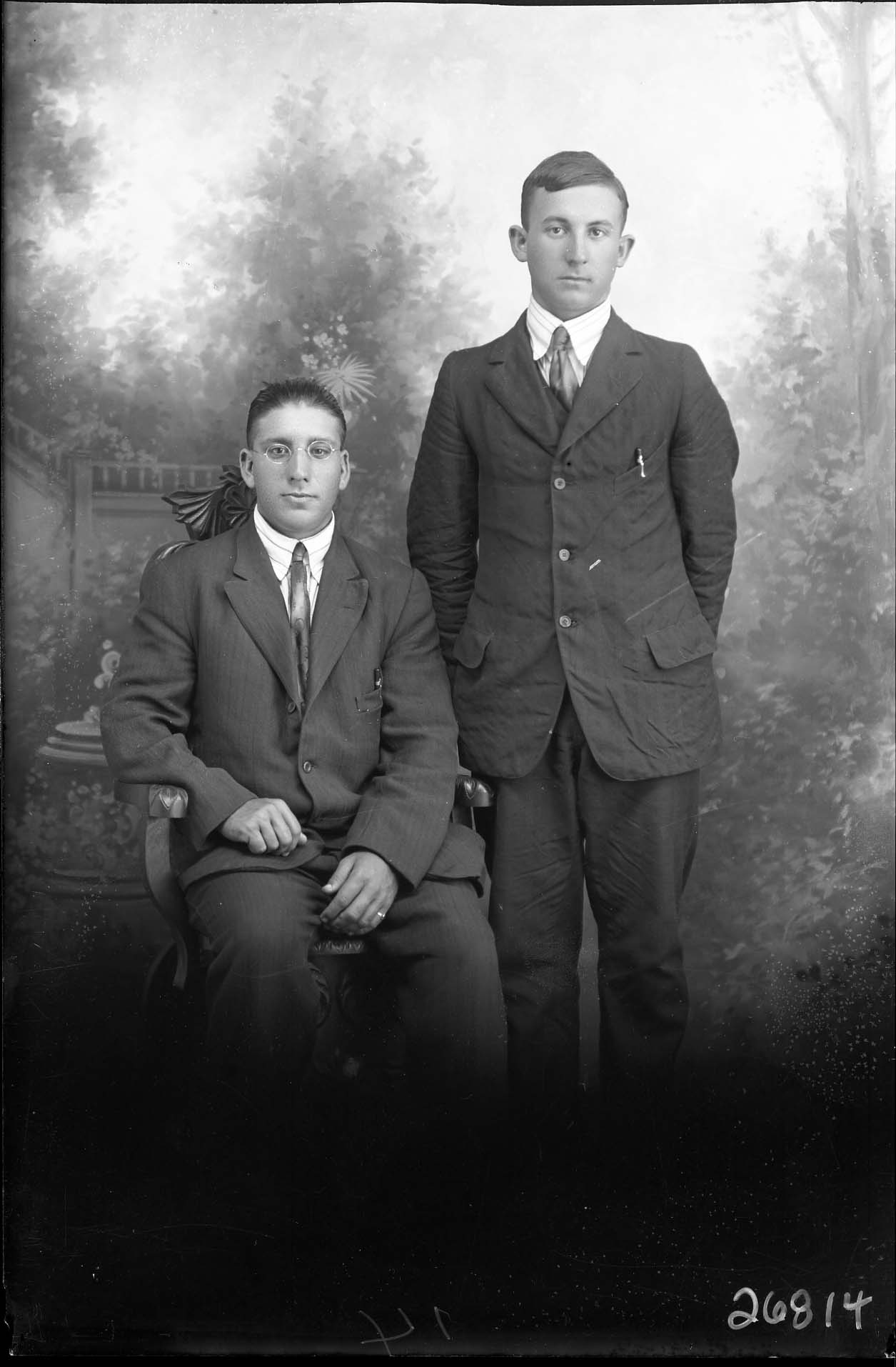 Two unidentified young men, one seated and one standing, are posed together in suits and ties.