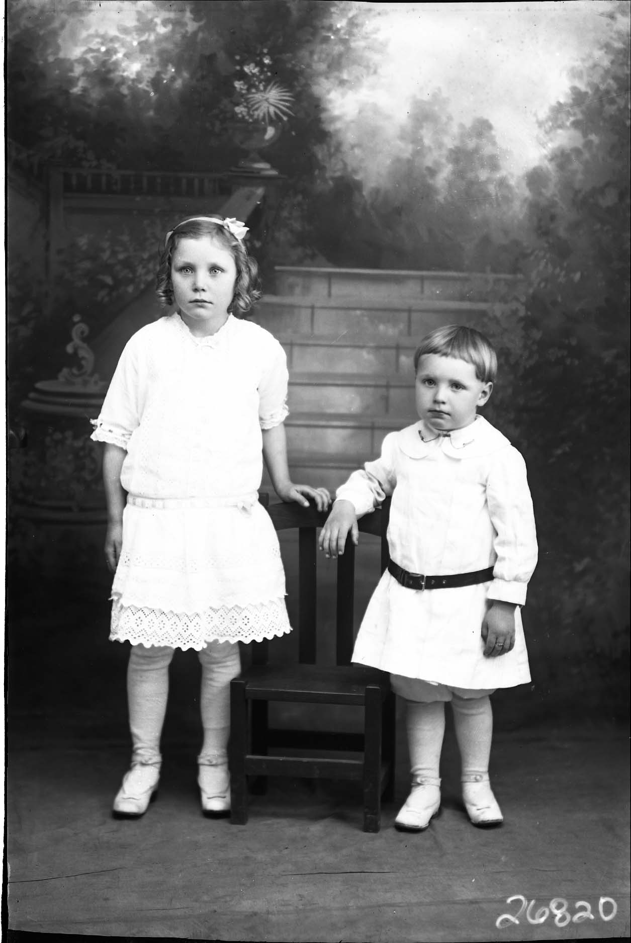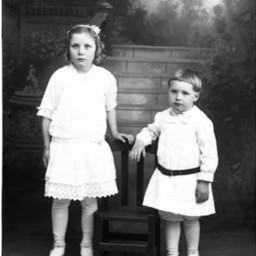 Two unidentified children of different ages, an older girl and a boy, are standing together.