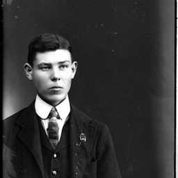 Portrait photograph of an unidentified young man wearing a suit and tie with a starched collar and a pin on his lapel.