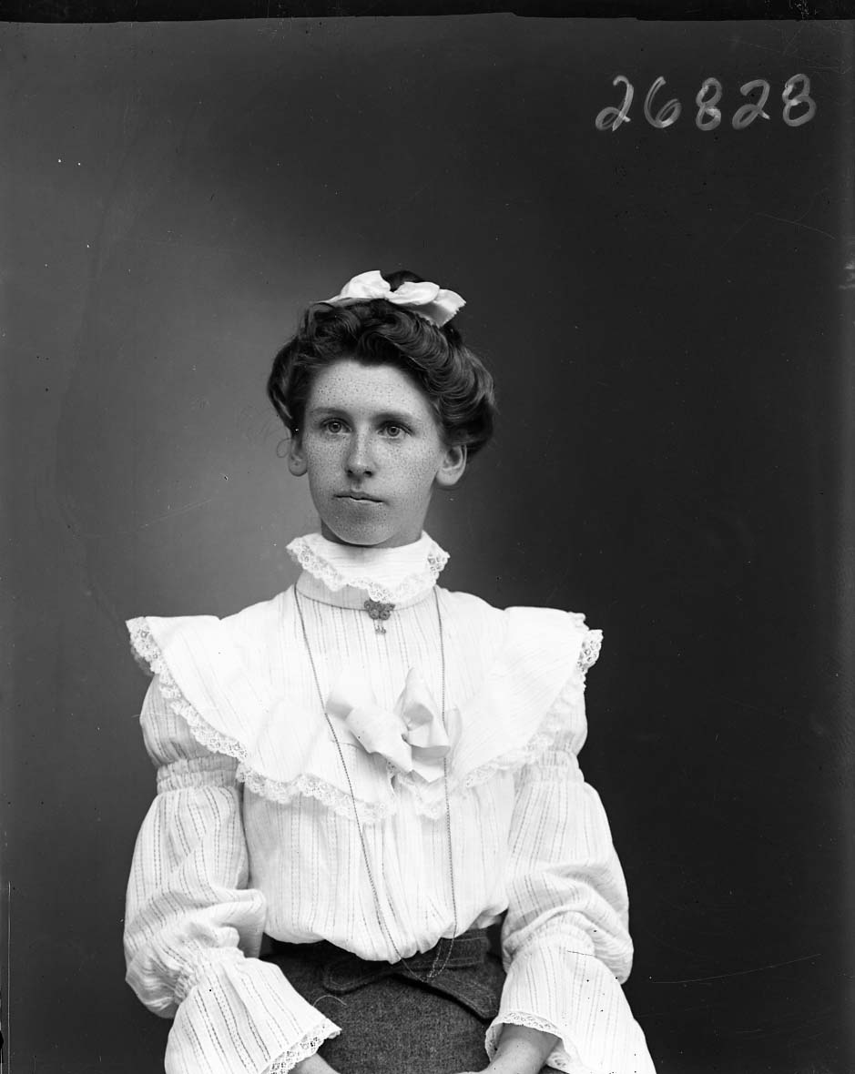 Portrait photograph of an unidentified young woman wearing a bow in her styled hair and a fashionable blouse.