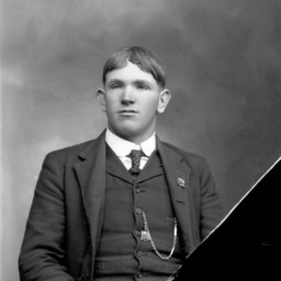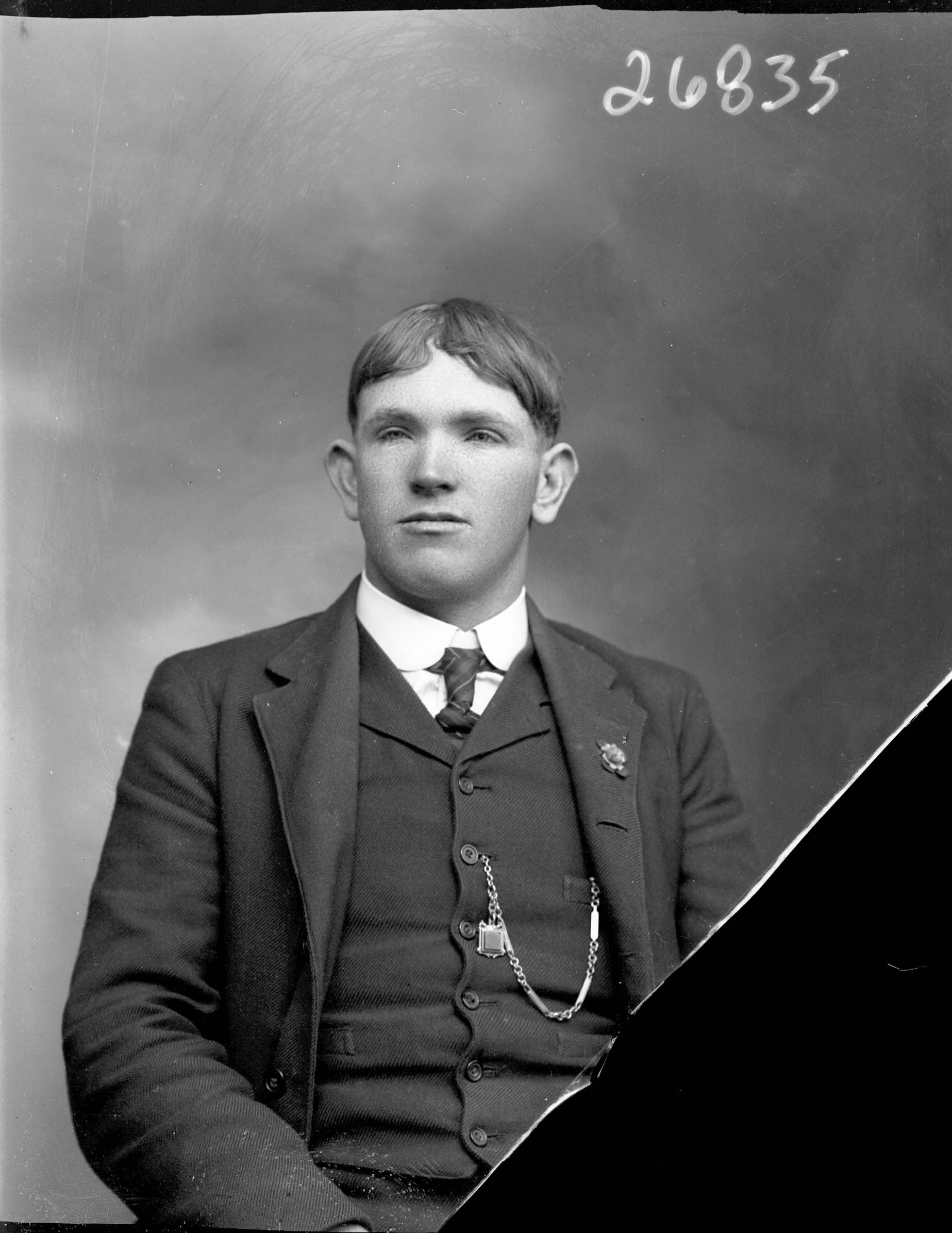 Portrait photograph of an unidentified young man wearing a suit and tie with a pin on his lapel and a chain visible extending across his vest.