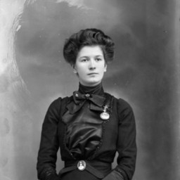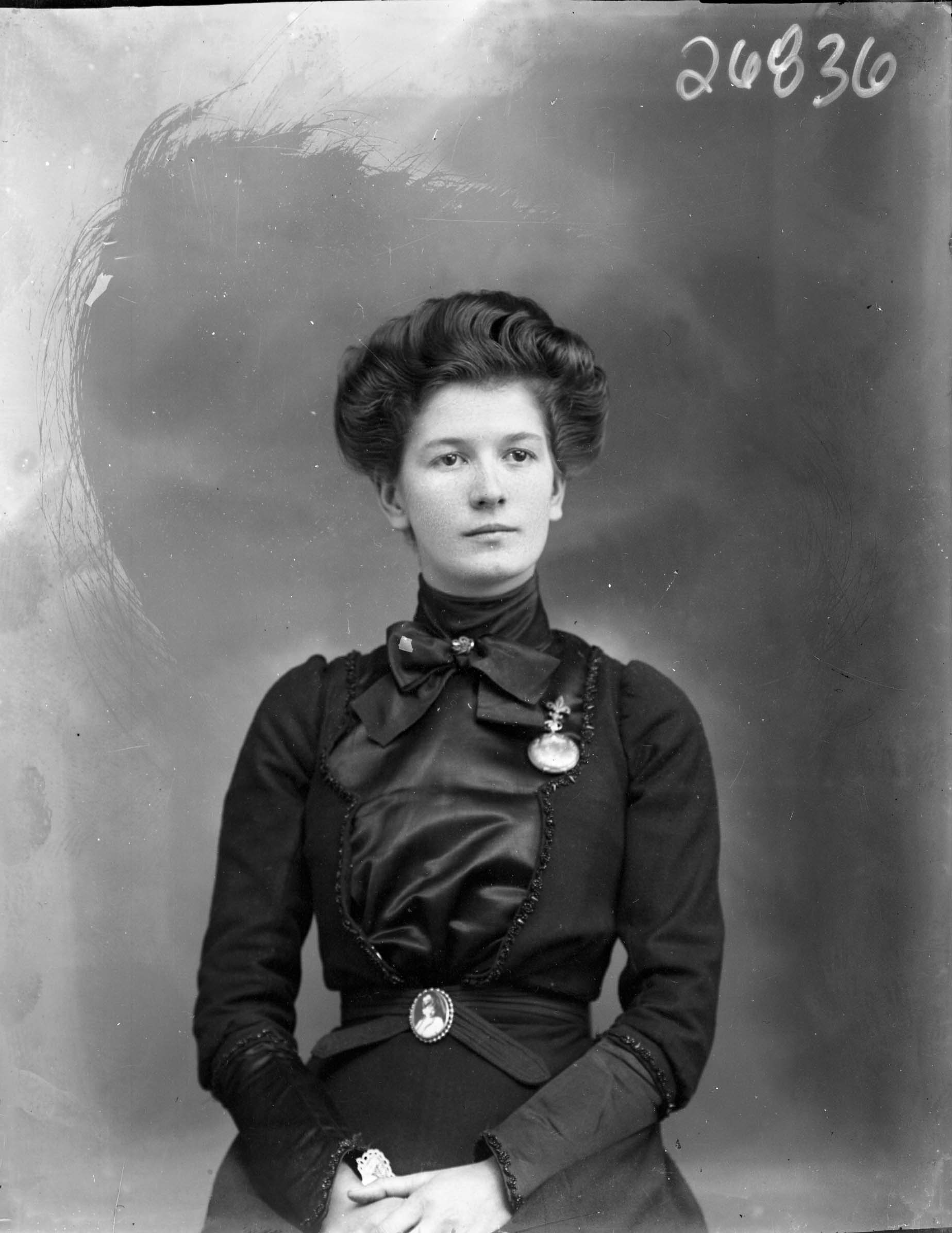 Unidentified woman with her hair pulled up is wearing a pocket watch pinned to her dress and a cameo brooch at her waist with a person's face on it.