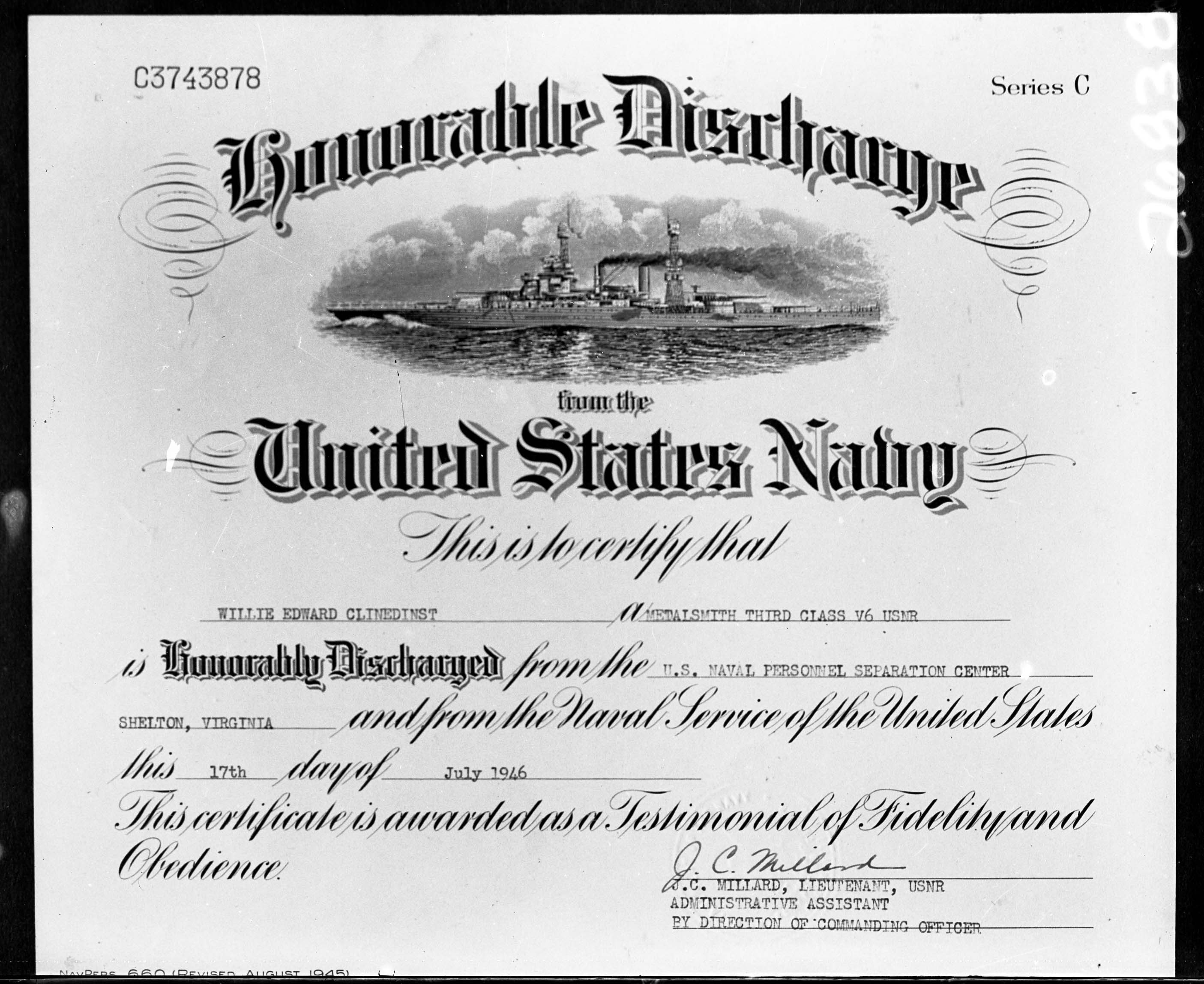 Willie Edward Clinedinst's U.S. Navy Discharge