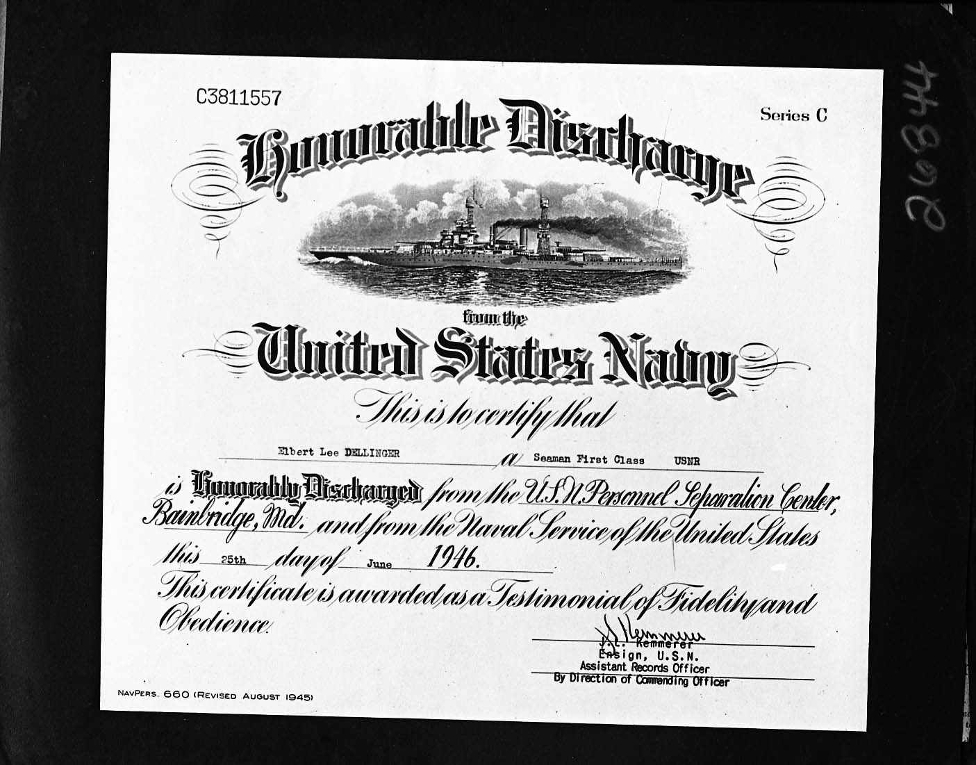 Photograph of the document certifying that Seaman First Class Elbert Lee Dellinger was honorably discharged from the Navy in Bainbridge, Maryland, on June 25, 1946.
