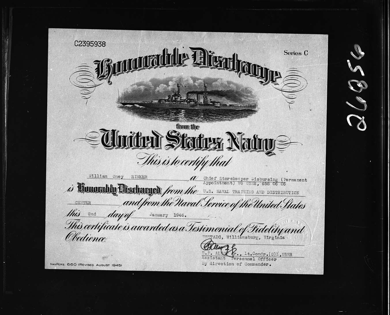 Photograph of the document certifying that Chief Storekeeper in Disbursing William Oney Rinker was honorably discharged from the Navy on January 2, 1946.