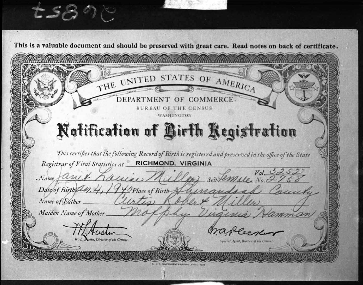 Photograph of the birth registration issued for Janet Louise Miller who was born on January 4, 1940, in Shenandoah County.