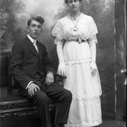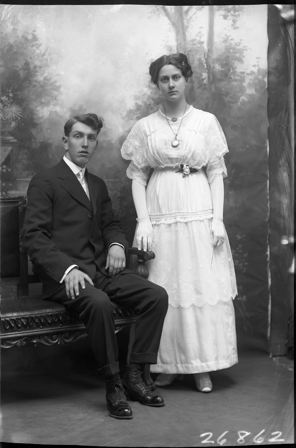 Unidentified man, seated, with an unidentified woman wearing a flower pinned to her waist, a locket, and long white gloves is standing beside him.