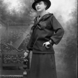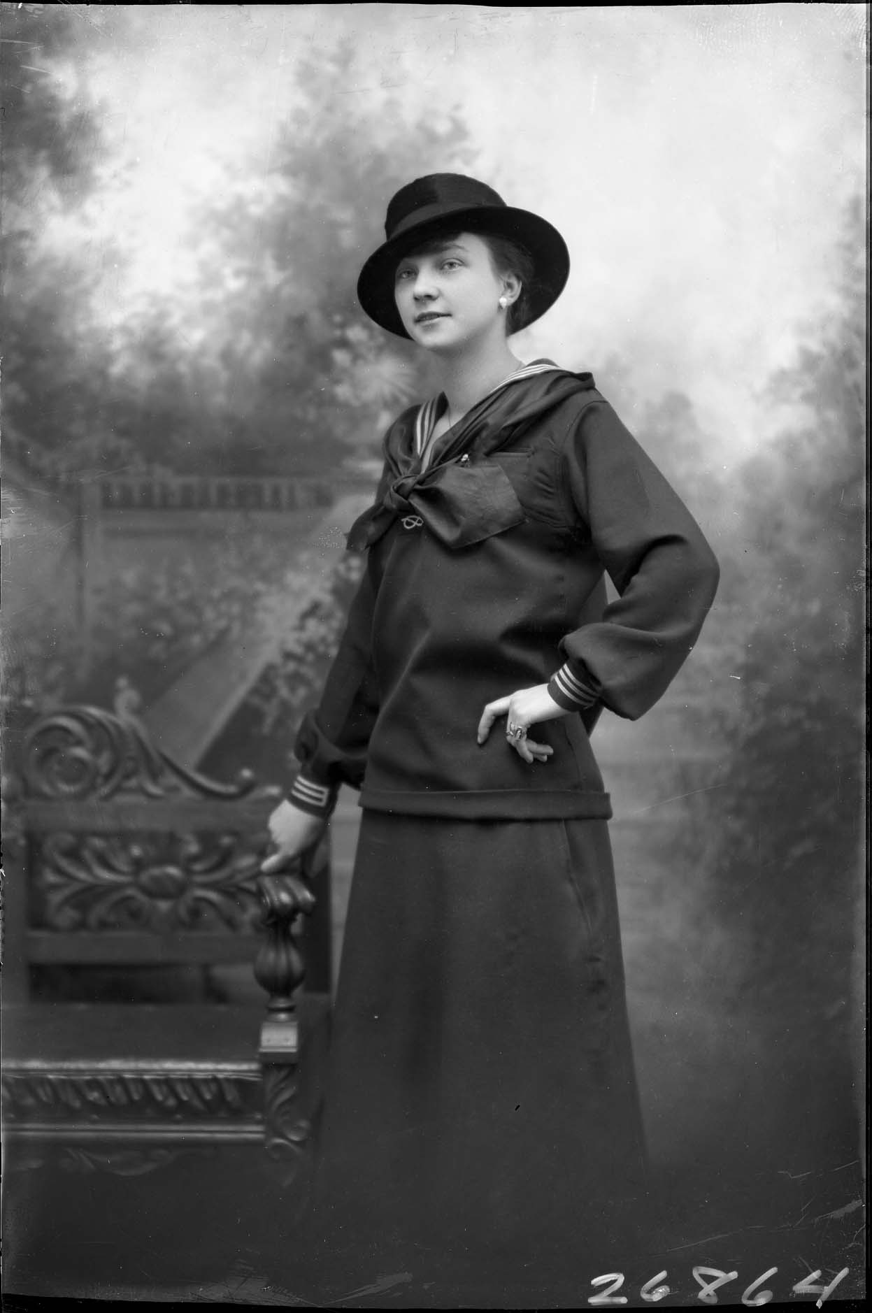 Unidentified woman in a hat is standing by a bench with one hand on her hip and wearing a sailor-themed outfit.