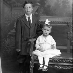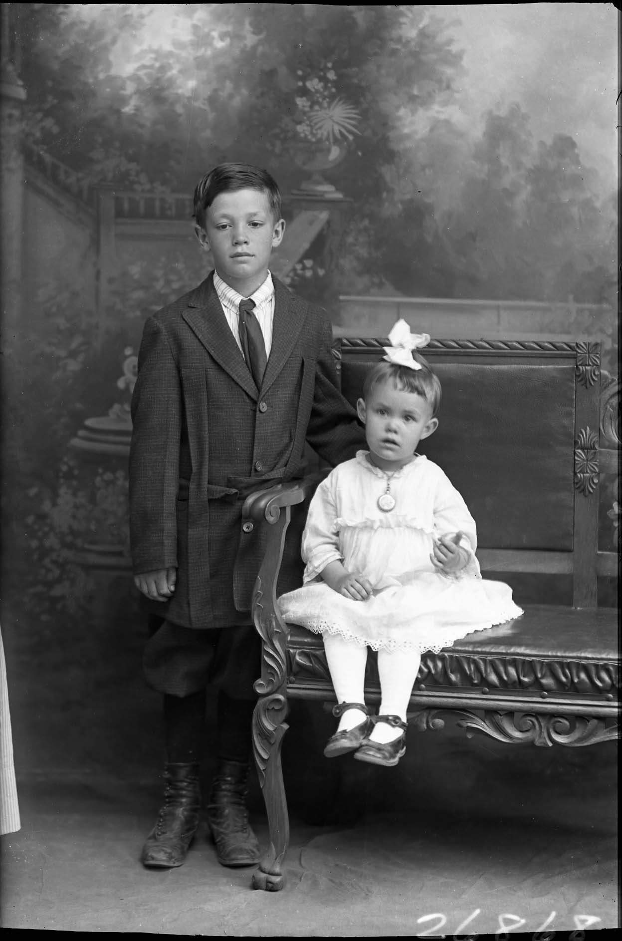 The boy, standing, is wearing a suit with short pants and a younger girl, seated beside him, has a bow in her hair and a locket around her neck.
