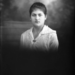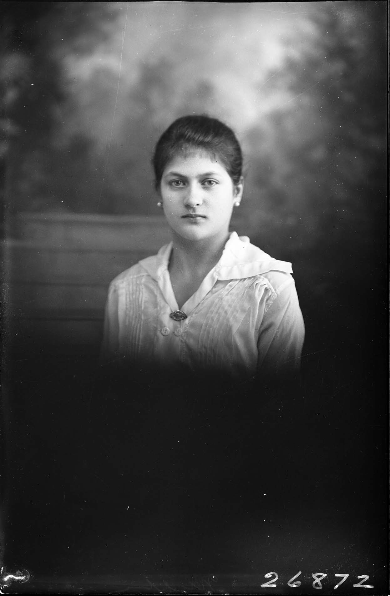 Portrait photograph of an unidentified woman with her hair styled back and wearing a pin on her blouse.