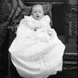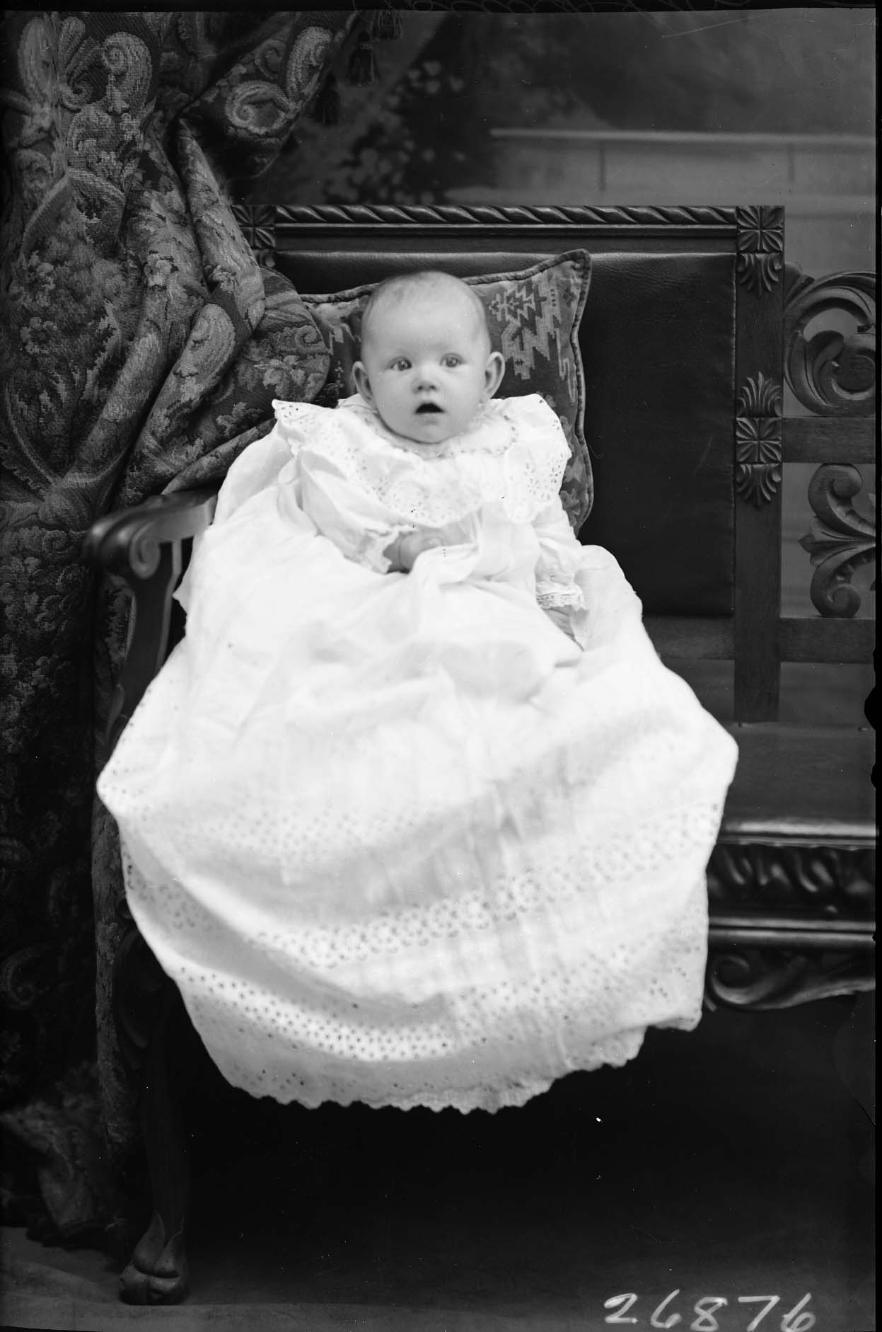 Unidentified baby in a long white gown is posed on pillows on a bench.