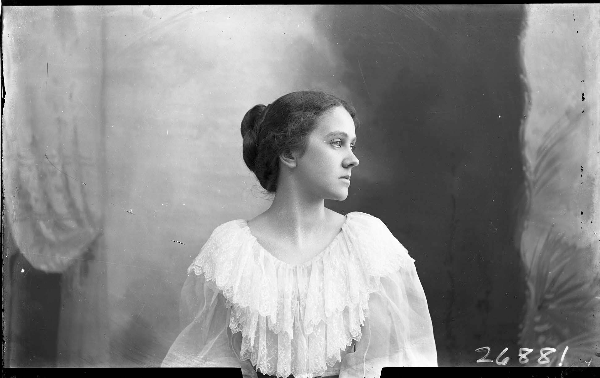 Portrait photograph of an unidentified young woman with her hair pulled back and shown looking to the side, in profile.