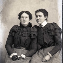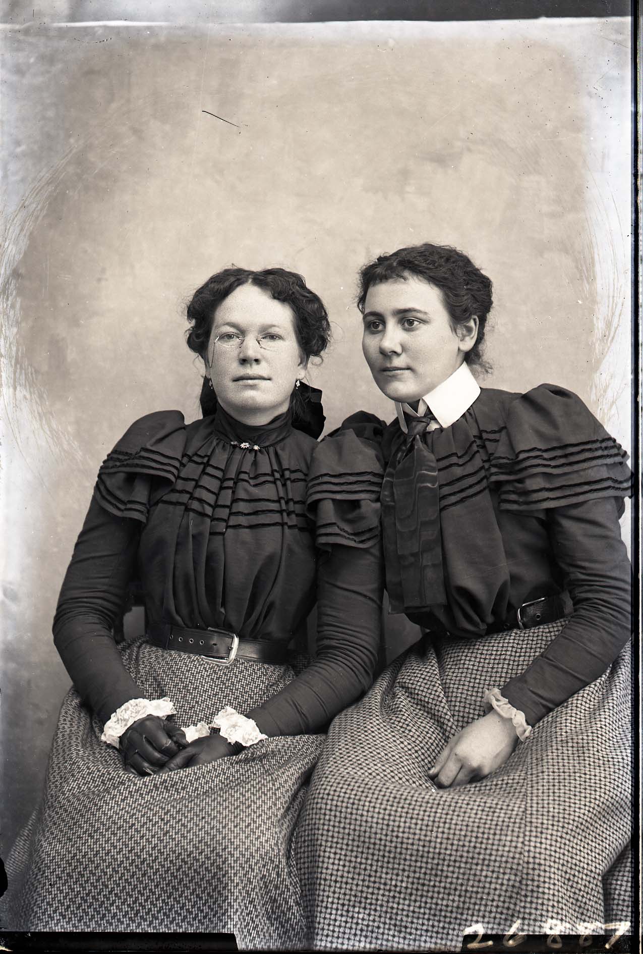 Two unidentified women are seated together. Both are wearing similar blouses and long skirts.