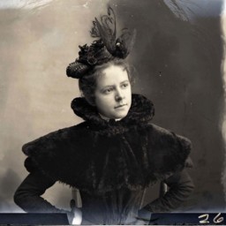 Portrait photograph of an unidentified young woman in a fashionable hat and wearing a fur mantle with a high collar.
