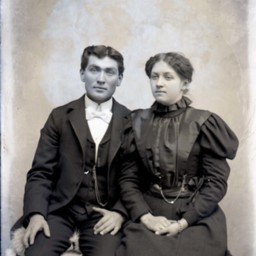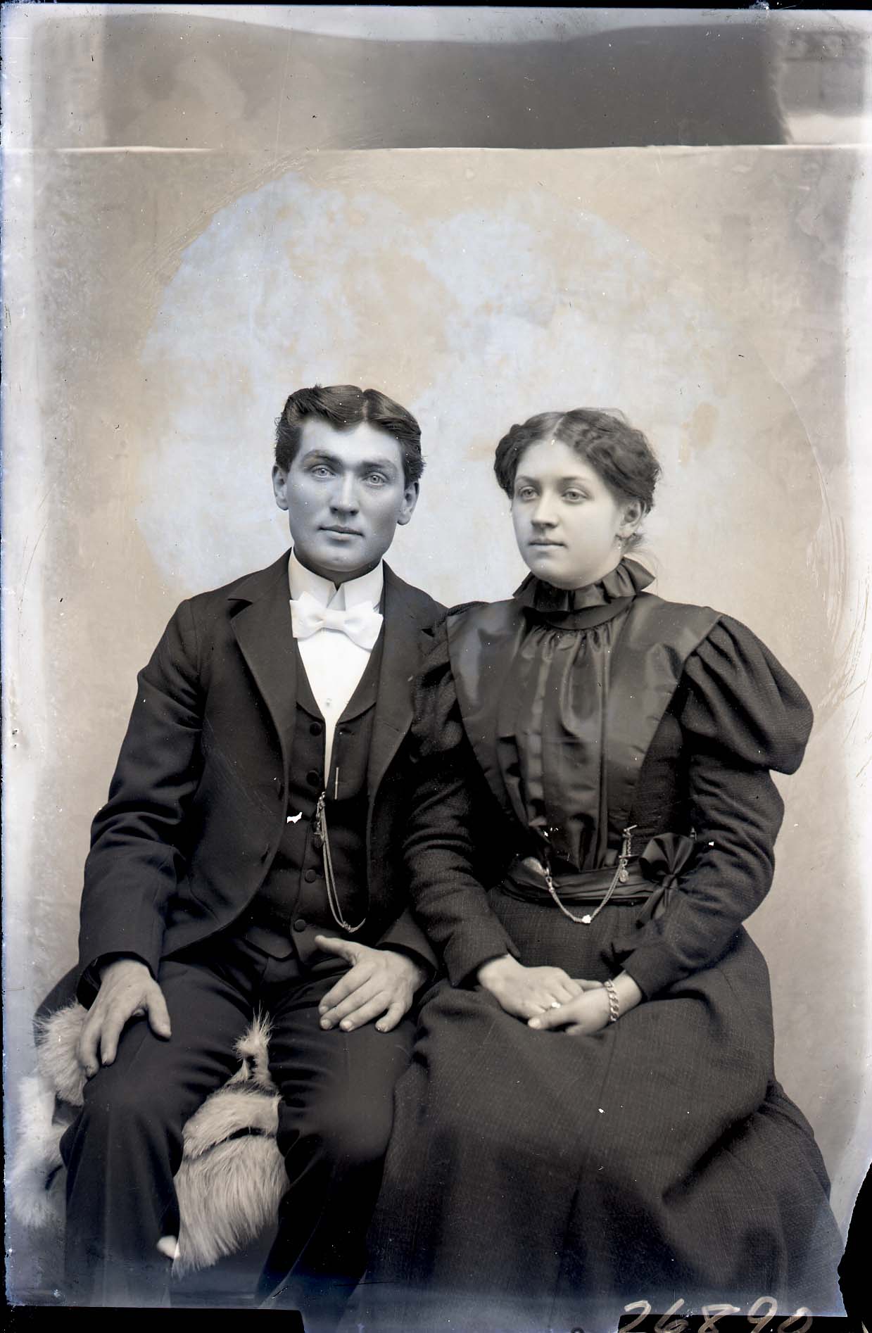 Unidentified man in a suit and bow tie with a starched collar is seated beside an unidentified woman, also seated, with her hands in her lap.