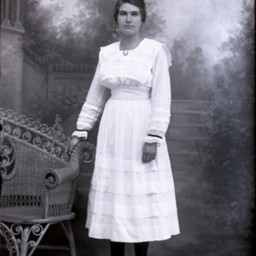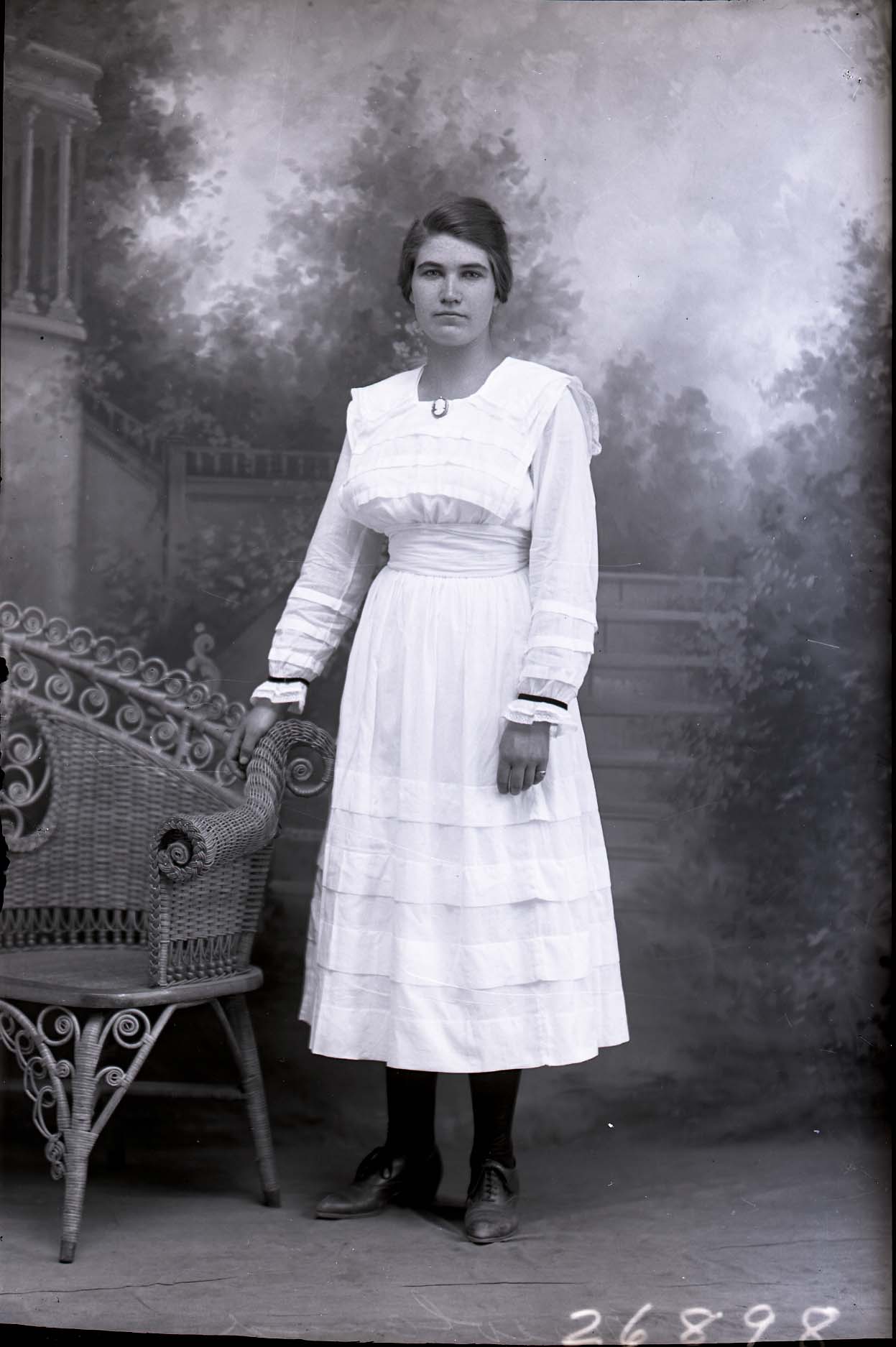 Unidentified woman is standing beside a wicker chair and wearing a cameo pin on the front of her dress.