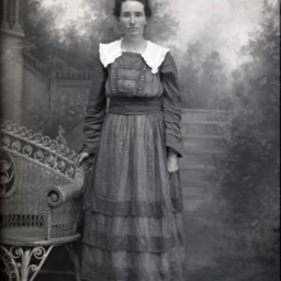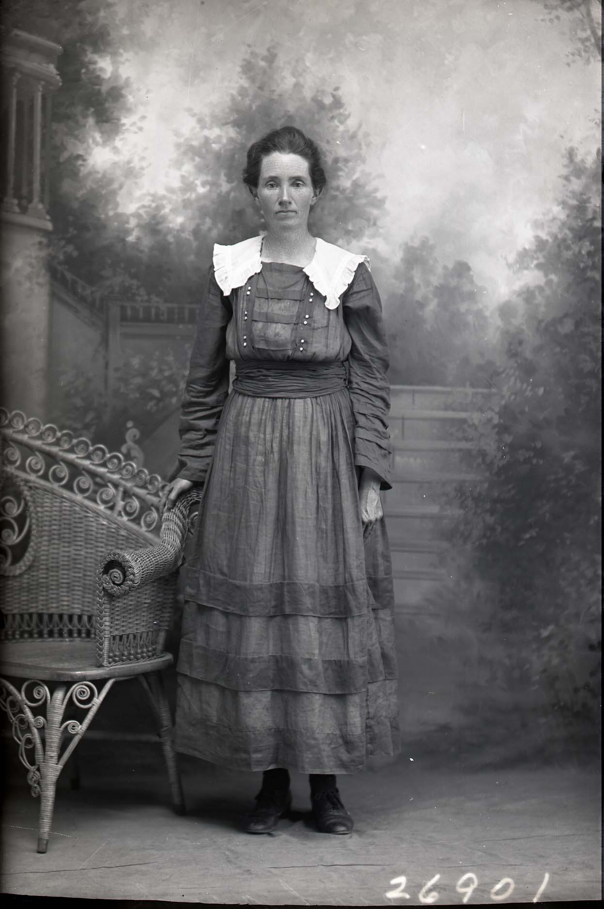 Unidentified woman is standing by a wicker chair and wearing a long, dark dress with a contrasting white collar.